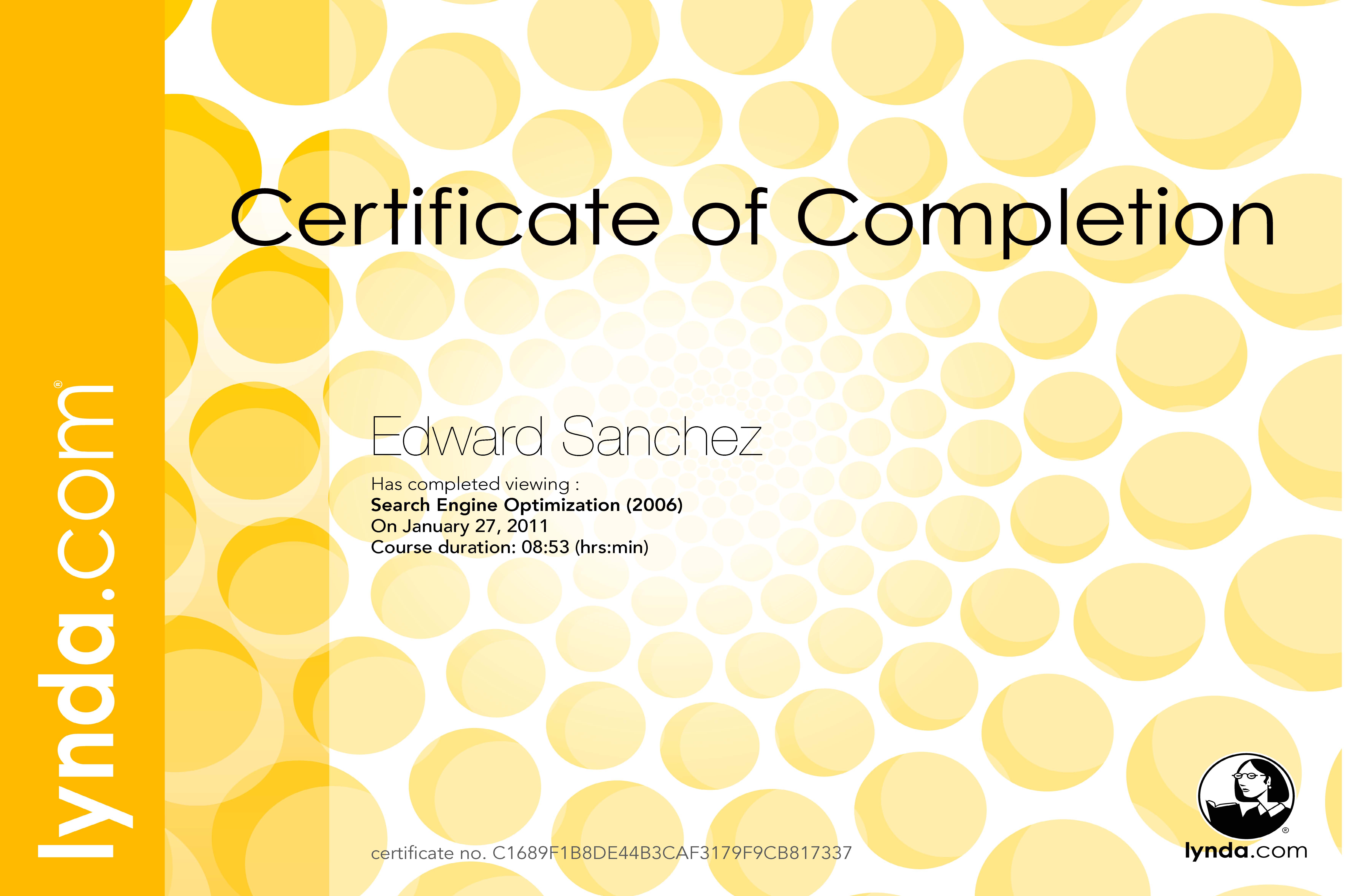 Recent Lynda.com certificates (Search Engine Optimization, WordPress, etc.) earned by Edward A. Sanchez (so far, more on the way!)