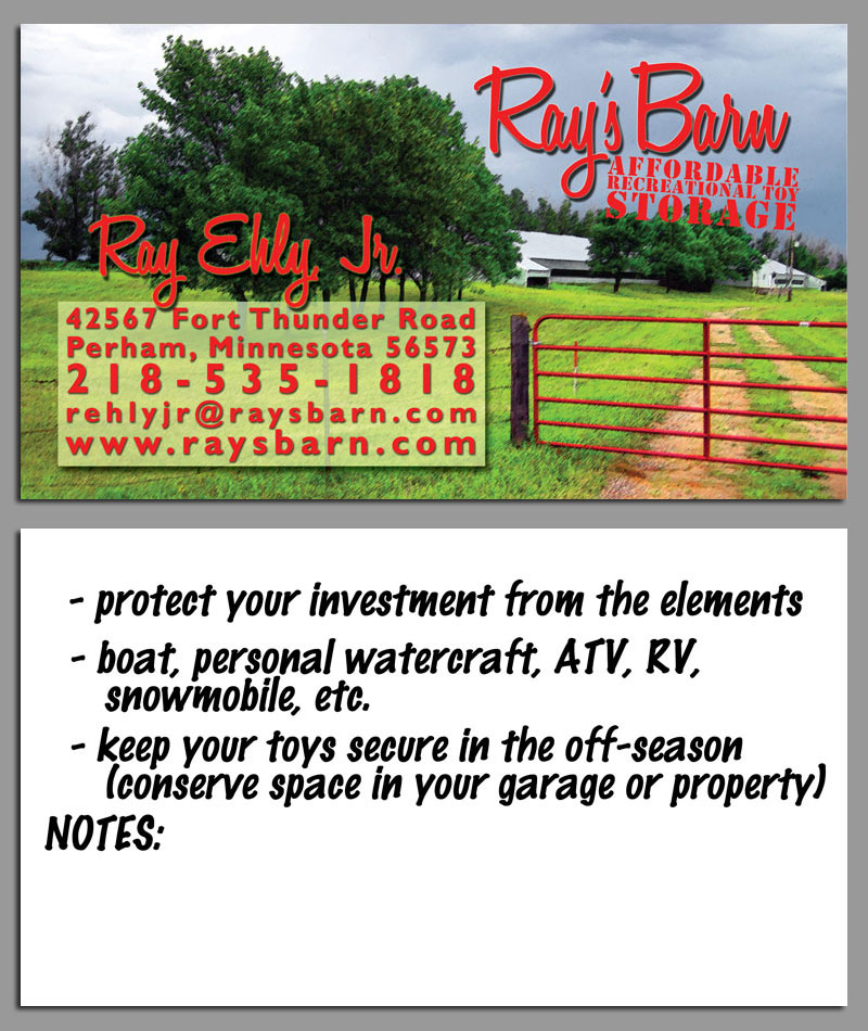 Business cards designed for Ray’s Barn owner Ray Ehly, Jr. Ray’s barn provides recreational toy storage in the off-season in Perham, Minnesota.